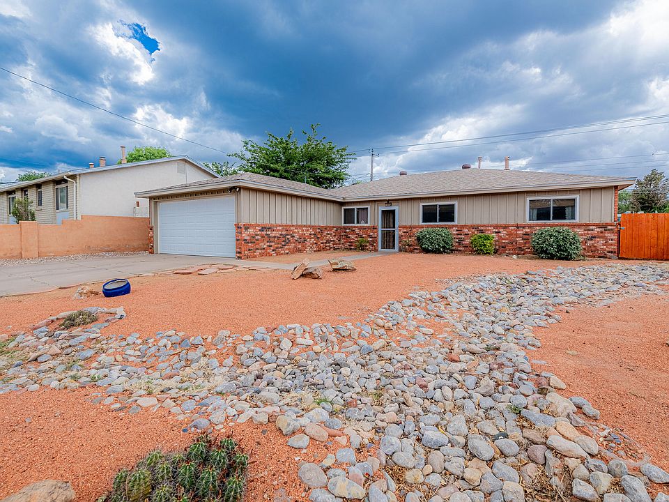 Charming single-story home with stunning Sandia views! Featuring 3 beds plus office or possible 4th bedroom, 2 baths, and 2 living areas, this well-maintained home offers an updated kitchen with butcher block countertops, stainless steel appliances, and ample cabinet space. Both bathrooms are beautifully remodeled with tile surrounds and updated vanities.Roof is only 4 years young with transferrable warranty!  Enjoy low-maintenance landscaping front and back, a large covered patio, and a private backyard with block walls, perfect for relaxing or entertaining. Includes a storage shed and a two-car fully finished and heated garage.