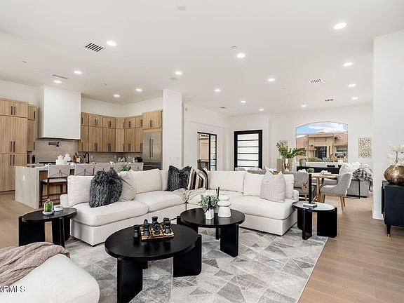Heated pool and spaLush desert landscapingCorner lotFull-length retractable glass wallLarge covered patioQuartzite countersWood floors