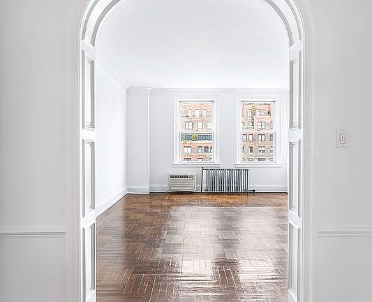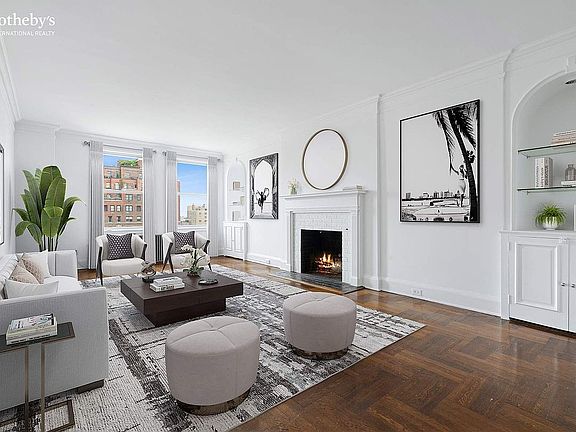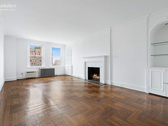Perfectly suited for entertaining, a semi-private elevator landing opens into a spacious central foyer, which leads to the grand living room framed by a graceful archway. Pre-war details abound from original parquet hardwood floors and elegant moldings to a wood-burning fireplace, custom built-in bookcases, and architectural niches.