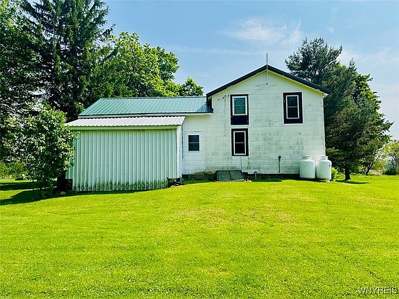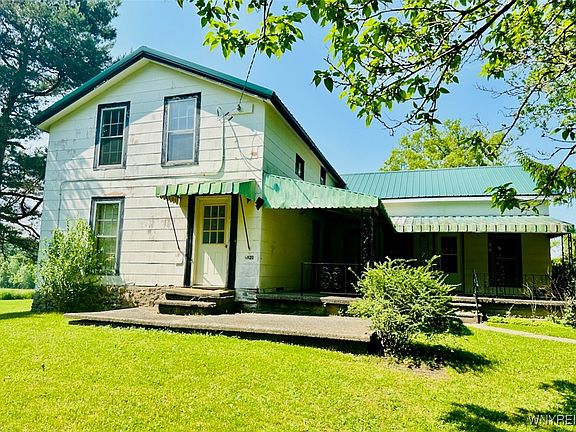 Location, location, location—and opportunity! This classic 19th-century farmhouse offers timeless charm and exceptional potential in a highly desirable location—just down the road from Arrowhead Golf Club and Rothland Golf Course, minutes to village amenities, and quick access to Route 5 and the Buffalo metro area. Set on over an acre in the Akron School District, the home features 3 bedrooms and 2 full baths, with the second level offering private exterior access—ideal as an accessory unit, guest suite, or future income opportunity. Additional highlights include: covered wrap-around porch perfect for relaxing or entertaining, durable metal roof, newer furnace (2024), public water and natural gas connection available, detached shed and small pole barn—great for storage, workshop, or hobbies. This is your chance to restore a piece of WNY history and make it your own. A rare blend of peaceful country living with close proximity to lifestyle amenities. Visionaries welcome—opportunity awaits! Home is being sold AS IS - seller will not respond to repairs requests as a result of a home inspection or appraisal. Seller requests to delay negotiations; offers due Thursday 6/19 by 12 PM.