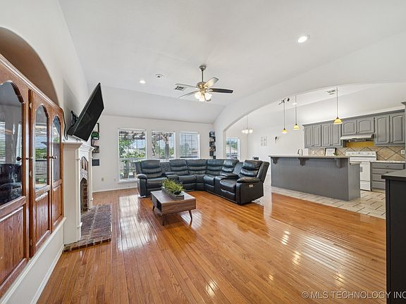 Charming 3-bedroom, 2-bath full brick home featuring an open floor plan with an island eating bar, perfect for casual meals and entertaining. Beautiful hardwood floors run throughout, and fresh interior paint gives the space a bright, updated feel. A built-in humidifier in the HVAC system adds year-round comfort. Enjoy a mature shade tree in the front yard and fruit trees in the backyard, a peaceful outdoor retreat. Located in the highly sought-after Jenks West Elementary school district. Seller is offering a 1-year Residential Service Agreement for added peace of mind.
