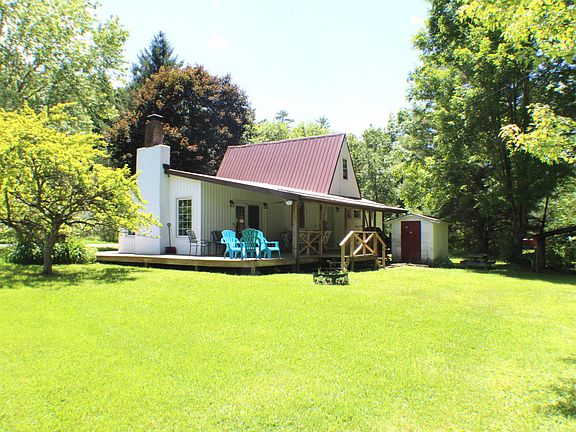 This adorable 2 bedroom, 2 bath A-frame has an additional bedroom in loft area. Many updates include large eat in kitchen with new hickory cabinets (2023), new roof, siding, plumbing, flooring, and central heat & air (2022). Also includes a 1 car detached garage, storage building, and a covered back porch offering a quaint spot to unwind. This home would make a great vacation get-away or Airbnb!