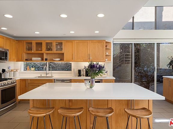 Sensational, light-filled architectural masterpiece in the heart of Brentwood. This front-facing townhome, part of an exclusive four-unit complex, was designed by renowned architect Michael Pearce & Associates and featured in Global Architecture and Homes Magazine. Offering 1,731 sq ft of contemporary elegance, the home showcases an open, sun-drenched floor plan with soaring ceilings, abundant windows, a dramatic skylight, and beautiful hardwood floors. The spacious dining area flows seamlessly into the inviting living room with a cozy fireplace, perfect for both entertaining and relaxing. The chef's kitchen impresses with a large center island, stainless steel appliances, and a spacious pantry, while the private patio provides an ideal space for outdoor living. Upstairs, two bedrooms and two bathrooms offer comfort and privacy. The primary suite feels like a serene retreat, featuring a walk-in closet and a luxurious spa-inspired bathroom with a marble dual vanity. The second bedroom includes its own ensuite bath. Additional highlights include an in-unit laundry area, an exclusive rooftop deck with stunning city and mountain views, and two side-by-side parking spaces plus a large private storage area in the garage.