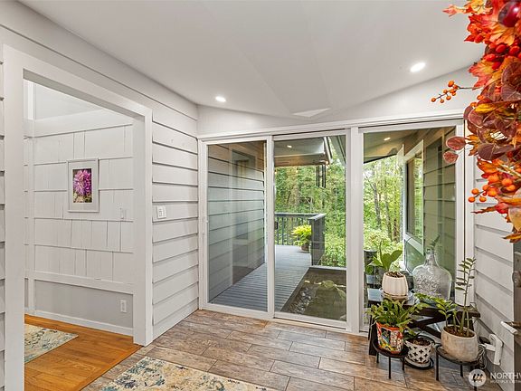 Tucked at the end of a quaint, treed lane, this 3,101 sq ft mid-century home rests on a thoughtfully landscaped .55-acre lot. Wall-to-wall windows fill the interior with natural light. The updated kitchen features granite counters, Viking appliances, a 6-burner gas stove, & an oversized farmhouse sink, flowing to a spacious dining room with built-ins & HUGE pantry. The main-floor primary suite offers vaulted ceilings, garden-view deck access, ensuite bath, and generous closets. Also on the main: a 2nd bedroom & office. Upstairs, a bedroom with attached office/flex space adds versatility. The lower level includes a huge bonus room, 3/4 bath, & laundry. Fresh exterior paint, 2-car garage, & stone paths complete this Bainbridge retreat.
