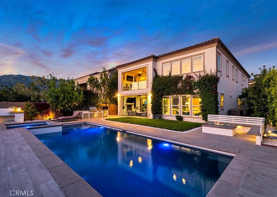 Experience exceptional luxury & panoramic mountain & city light views in this meticulously appointed 5 bed, 5.5 bath, nearly 4K sq ft residence located in the prestigious guard-gated community of Bella Vista, Porter Ranch. Showcasing high ceilings, recessed lighting, built-in speaker system, & engineered wood flooring throughout, this home blends refined design w/ modern convenience including energy efficient, owned, solar panels, tankless water heater, & dual zone AC! Formal entry opens to 2-story foyer w/ elegant, curved staircase on 1 side, & beautiful formal dining room w/ tray ceiling on the other. Butler’s pantry connects seamlessly to a wonderful jewel of a kitchen, truly a chef’s dream, complete w/ walk-in pantry, high-end, stainless-steel appliances, including six-burner range, double ovens, dishwasher, wine fridge, & central island w/ large farmhouse sink & breakfast bar seating. The kitchen anchors a spacious great room w/ wall of windows framing stunning backyard views, casual informal dining area, & a cozy family room area boasting oversized, tripartite glass slider out to a California room, that can be fully opened to enjoy indoor/outdoor living, w/ a fireplace, ceiling fans, & recessed lighting. 1 spacious bedroom w/ large walk-in closet & en-suite ¾ bath makes a perfect guest or Mother-in-law suite downstairs. Upstairs, the grand staircase leads to spacious loft/landing ideal as secondary living space, office, or playroom. Primary suite boasts high tray ceilings, sitting area, & private glass-railed balcony w/ ceiling fan, recessed lighting, & sweeping views. The en-suite bath offers quartz counters, dual vanities, dual walk-in closets, soaking tub & separate glass-enclosed shower. There are 3 additional, good-sized bedrooms upstairs; 2 w/ well-appointed, full-en-suite baths, 1 w/ a walk-in closet, 1 w/ a Juliet balcony & access to the full, hall bath. Additional features include a convenient upstairs laundry room & finished 3-car garage w/ direct access. The lush backyard is an entertainer’s paradise w/ 8 speaker Episode sound system including in ground bass speaker, a custom outdoor kitchen (featuring BBQ, fridge, sink, utility drawers, & side burner), sparkling pool w/ waterfall & spa, firepits w/ built-in seating, lemon tree, & open fencing to maximize the panoramic views. The community offers resort-style amenities, 24-hour security, & proximity to award-winning schools, fine dining, shopping, & all the best Porter Ranch has to offer.