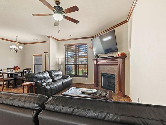 WELCOME HOME to this 3 bedroom, 2 bathroom + office with a closet (could be 4th bedroom) home in Mustang school district. This home features a split floor plan with primary suite on opposite side from secondary bedrooms. The kitchen, dining and living room share an open concept with gorgeous granite counter tops throughout, custom-built maple wood cabinets and a brand new dishwasher. Feel safe with an in-ground storm shelter located in the 3 car garage. The added concrete to the back patio adds more space for entertaining along with the added storage in the 10x16 storage building. Enjoy the brand new play ground and pavilion just beyond the back fence-you could even have your own personal gate. Schedule a private showing today while it lasts!