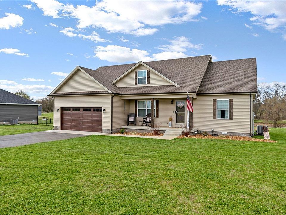 This stunning 3-bedroom, 2-bathroom residence nestled on a generous 1-acre lot. With a convenient split bedroom floor plan and open concept design, this home provides ample space at 1,640sqft. Living room boasts vaulted ceilings, creating an airy and inviting atmosphere. The large master bedroom features tray ceilings, a double vanity master bath, and a spacious walk-in closet. Relax on the covered front porch or entertain on the deck overlooking the sprawling yard, complete with a charming firepit and a peaceful pond stocked with fish. Additional highlights include a convenient two-car attached garage, a spacious laundry room, and the serenity of country living just moments away from conveniences. Perfectly situated between Franklin and Bowling Green. Don't miss the opportunity to make this your forever home!