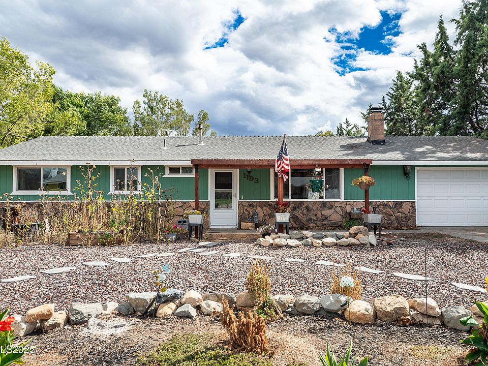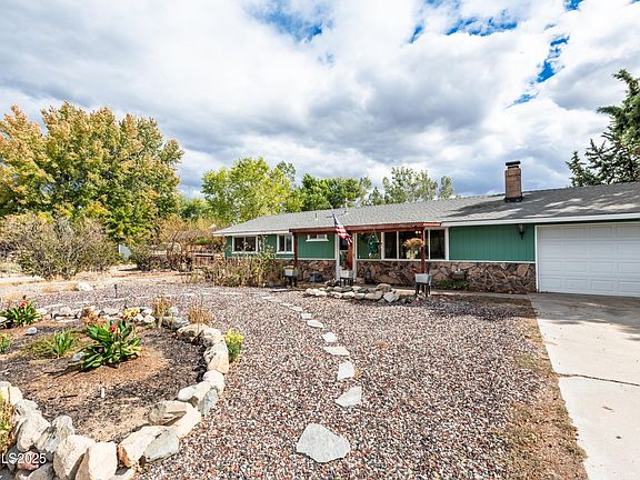 Discover your slice of Gardnerville, NV at 1193 Manhattan Way, where sweeping Sierra Nevada sunset views create a daily masterpiece from your doorstep. This thoughtfully designed three-bedroom, two-bathroom home spans 1680 square feet and sits on a generous .29 acres, offering the perfect blend of comfort and entertainment space, all on one convenient level just minutes from Lake Tahoe's pristine waters and Carson City, Nevada's state capital with excellent shopping opportunities and government services. You'll also enjoy close proximity to historic downtown Minden, where charming restaurants serve everything from casual fare to fine dining, entertainment venues provide year-round activities, and exciting casinos offer gaming and shows, all while maintaining the smaller city, relaxed atmosphere that embodies the Nevada lifestyle. The heart of this home showcases an open floor plan concept anchored by a welcoming fireplace, creating seamless flow between living areas. The kitchen features beautiful granite countertops that complement the light and bright atmosphere enhanced by newer windows and updated laminate flooring throughout. Two fireplaces ensure cozy evenings year-round - choose between the crackling warmth of the wood-burning fireplace or the efficient comfort of the pellet stove. Your primary bedroom sanctuary includes a luxurious soaking tub surrounded by elegant stone work, while a charming bench with abundant storage sits perfectly positioned by the great room window. The large bonus room off the back provides versatile space with its own pellet stove and clever sliding barn door for privacy when desired, plus convenient backyard access for seamless indoor-outdoor living. Step outside to your expansive backyard oasis featuring a peaceful fountain, while the front welcomes guests with a covered pergola complete with its own fountain feature. Practical perks include recreational vehicle parking for your adventure-ready lifestyle and no homeowners association restrictions, giving you freedom to truly make this space your own. With quick highway access via Route 88 and 395, you'll enjoy connectivity while maintaining mountain living charm. Nearby Lampe Park and Minden Park offer recreational opportunities, while the Carson Valley Swim Center and Douglas High School serve community needs. This single-level gem combines Sierra Nevada beauty with modern conveniences.