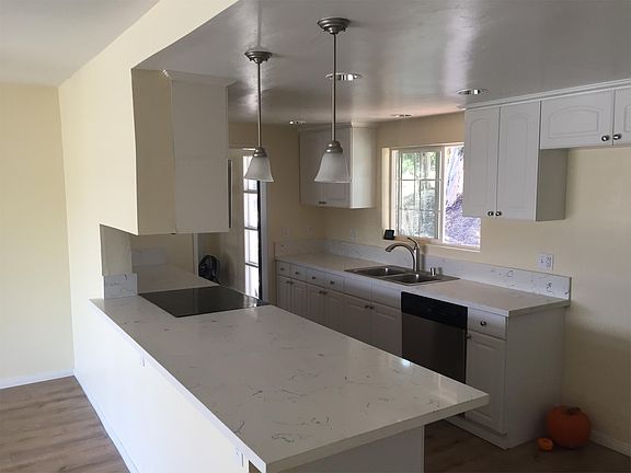 Open layout with upgraded kitchen featuring hardwood floors, modern appliances and quartz counters. Ample pantry and storage space in the kitchen with side counter featuring cabinets above and below. Great views out of almost every room including the kitchen, eating area, living room and bedrooms. New carpet, paint and AC Condenser. Set on three acres with a terrific view of the mountains, gated driveway on a very private street. Old growth trees and shade with fantastic breezes. Plenty of parking and room for a RV, tons of space for kids to play. Upgraded kitchen with an open layout to eating area with a sliding door and sweeping views. Three bedrooms upstairs with one downstairs, home features tons of storage with linen closets outside both bathrooms and a large walk in closet in the master.
