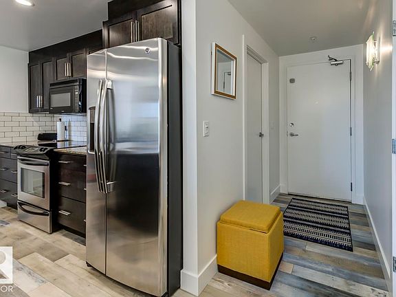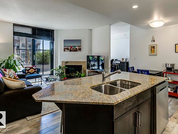 Live in style at the prestigious Illuminada II! This upscale 1 bed + den unit is packed w/ upgrades & offers a rare blend of luxury, function, & location. The sleek kitchen features granite counters, S/S appliances & an eating bar, all overlooking a sunlit living room w/ a cozy fireplace. Step out to your MASSIVE 343 sqft PRIVATE PATIO—a true outdoor oasis w/ gas BBQ hookup & water tap, ideal for entertaining or unwinding. The spacious primary boasts a spa-inspired 3pc ensuite, while the den adds flexibility as a home office or guest space. Extras include a 2pc bath, in-suite laundry w/ added storage, A/C, new heat pump (2024), newer laminate floors (2018), LED lighting, updated shower (2018), new carpet (2023) & fresh paint. Titled underground parking adds convenience in this sought-after, well-maintained building. Steps to fine dining, shops, transit, river valley trails & Victoria Golf Course—this is elevated downtown living at its best!