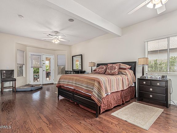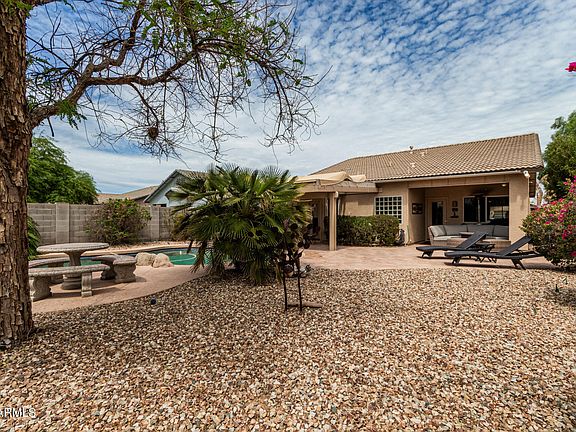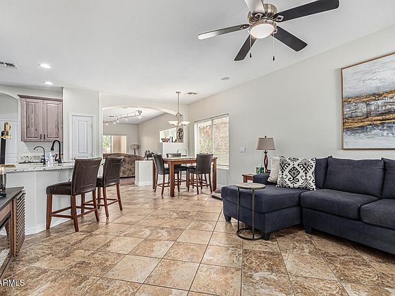 UNIQUE FIND OASIS IN THE DESERT-POOL-UPDATED INTERIOR This fully furnished home is truly move-in ready! Open floor plan with newly upgraded granite counters, modern cabinetry and breakfast bar overlooking the great room. Tile flooring throughout main living spaces with wood floors in bedrooms create a warm feel. The huge master suite offers backyard access, walk-in closet, dual sinks, soaking tub & separate shower. Bedrooms 2 & 3 were converted to a mega bedroom. Seller is willing to convert to 3 bed w/ acceptable offer. Updated guest bath w/ granite vanity. Backyard retreat with sparkling pool, extended covered patio, solar heated water, misting system all in an oversized lot for privacy. Inside laundry with cabinets, 2-car garage & water softener all in a golf course community.