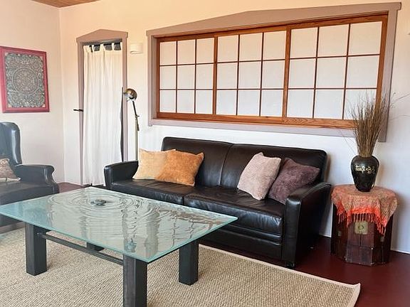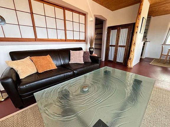 It has one bedroom, one bathroom, a living room, a dining pace, and a kitchen with an adjacent washer and dryer; A separate flex space suits meditation, writing, or a compact office (the Internet is strong and reliable). Natural materials, zen-like simplicity, and plenty of sunlight create a restorative setting a perfect retreat from modern busyness for one or two people.