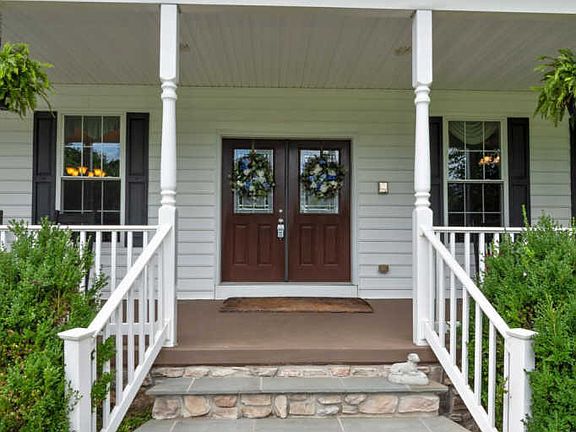 MAKE A SUMMER SPLASH! Incredible Pebble Tek saltwater pool with waterfall feature and poolside pavilion is ready for warm weather, parties, barbecues and relaxing! Tucked away on just over 3 acres enveloped by mature trees, this custom built home will be the envy of every guest! Welcomed by a charming, wrap around front porch, enter to find gleaming hardwood floors and plentiful natural light throughout the main level. Prepare your favorite meals in the farmhouse inspired chef's kitchen featuring granite counters, stainless steel Kenmore Pro appliances, farm sink, island, breakfast bar and sunny breakfast room with access to screened in back porch and views of the pool. Cozy family room off kitchen offers plenty of space to relax and unwind in front of the stone surround fireplace with pellet stove insert. Main level Owner's suite boasts peaceful wooded views, walk in closet and spa like attached bath with jetted tub, separate shower and double vanity. Upper level hosts comfy bedrooms with large closets, 3 with attached full bathrooms, and sun soaked sitting room with built in bookcases. Fully finished, walk up lower level features expansive rec room with wet bar, full bathroom and bonus room great for hosting out of town guests, and plenty of storage space. Complete with attached 3 car garage, detached 2 car garage-workshop equipped with water, electricity~including heat and AC and built in cabinetry. Private, pastoral setting close to everyday needs, this home is all you've been searching for!