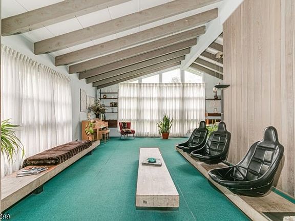 Mid Century Modern Split Level. This timelessly iconic, open floor plan home features soaring, beamed, vaulted ceilings in kitchen, dining room , living room and family room addition, all on the 1st level. The walls of windows marry the indoor with the outdoor spaces. The 2nd level has master en-suite with full bath, 3 generous additional bedrooms and hall bath. Hardwood floors thru out. The ground level boasts a den, 1 2 bath and laundry. The utility room is in the partial basement. An oversized 43'x20' tandem garage is roomy enough for 5 cars, plus a circular driveway with additional parking. Located on a quiet tree lined street, moments to schools, parks NYC transit. Home Warranty Included .
