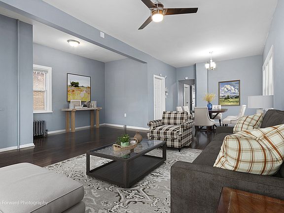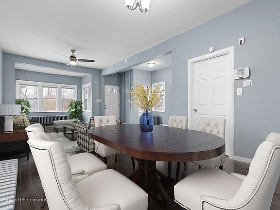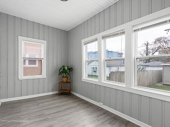 Beautifully remodeled home featuring 2 bedrooms and 2 full bathrooms. Home has open concept Living/Dining room with hardwood floors. 1st floor bedroom/office with hardwood floors. Kitchen has stainless steel appliances and microwave, kitchen and bathroom both have ceramic tile floors. 1st floor enclosed porch with vinyl plank flooring provides extra entertaining space. Renovated carpeted 2nd floor is perfect for a primary bedroom with extra living and closet space. Finished basement with bonus room and office, vinyl plank flooring and a full bathroom. Washer/dryer and storage area. Fenced back yard, new roof on both home and 2 car garage. Home is located close to transportation and within a few miles from shopping, expressways and Kroc Community Center. This refreshed beauty is offered As-Is only.