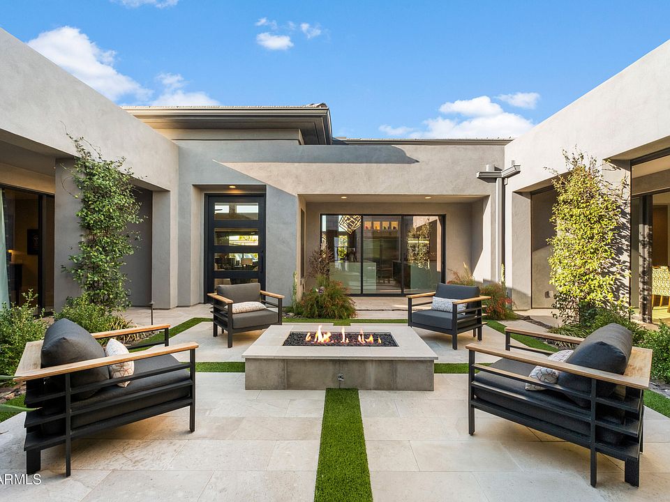 This Boulder Ranch home in North Scottsdale blends modern luxury with a serene desert setting. The exterior features clean architectural lines, stucco, stone accents, and native landscaping. A private courtyard leads to a spacious interior with soaring ceilings, custom shelving, and floor-to-ceiling windows. The chef's kitchen boasts waterfall-edge islands, quartz countertops, and top-tier appliances, perfect for entertaining. The primary suite offers dual walk-in closets, a spa-inspired bathroom, and backyard access. Additional guest suites, a private casita, a pool, spa, outdoor kitchen, heated patios, and a five-car climate-controlled garage enhance the living experience. Whole-house automation completes this luxury retreat. (for More DETAILED DESCRIPTION Please Click More) Experience the allure of an exquisite residence, where luxury meets sophistication. This spacious home in North Scottsdale epitomizes modern elegance, nestled harmoniously in a serene desert setting. The exterior boasts clean architectural lines and a stunning blend of stucco and stone, surrounded by natural landscaping with native plants like ocotillo, agaves, and desert blooms.
