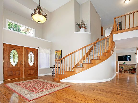 Enticing 5 Bed/4.5 Bath Buttercreek Estates pool home located on a cul-de-sac with exquisite upgrades. Great curb appeal with 3 car garage. Features include wood floors, formal step down living room, vaulted ceilings, crown molding, ceiling fans and interior windows to lovely formal dining room. Remodeled kitchen complete with large center island with seating area, wet bar, granite counters, custom cabinets, stainless appliances, and custom ceiling. Kitchen opens to large cozy family room with upgraded stone fireplace and a large eating area. Upstairs boasts four bedrooms, two with built-in wall units, 2 full bathrooms and a main bedroom suite which includes an expansive seating area, outside balcony deck, large walk in closet and remodeled bathroom. One bedroom and full bathroom downstairs is perfect for guest room or office. Too many upgrades to list. The backyard completes the package with tons of privacy, salt water pool & spa with waterfall, patio areas for entertaining and scenic private hillside. Close to shopping, attractive parks and schools. This home has it all!