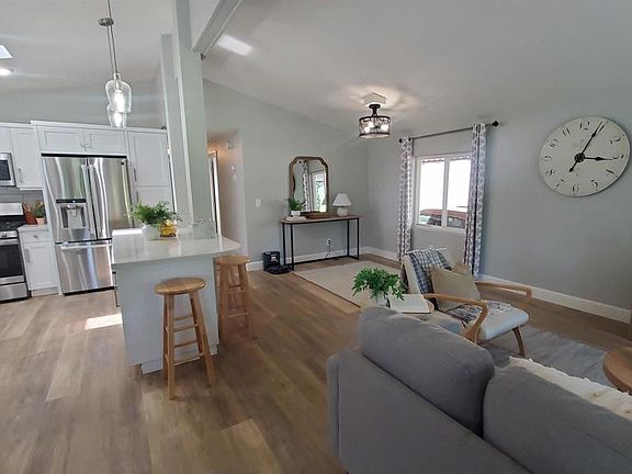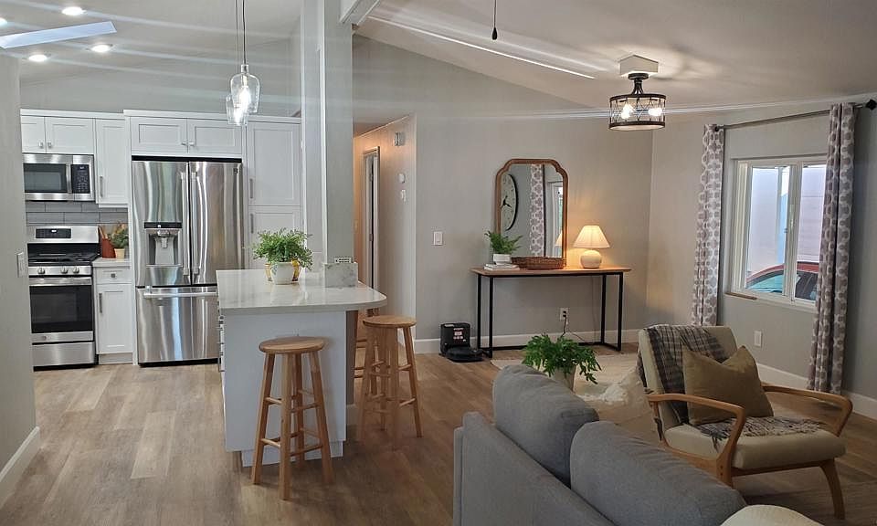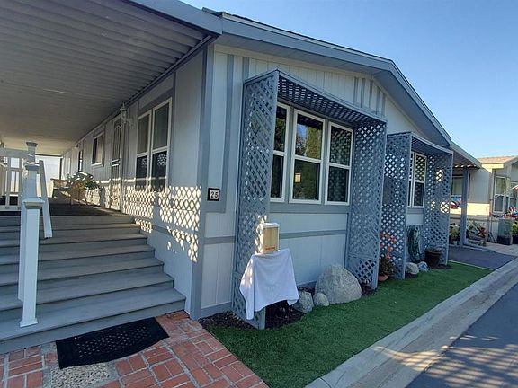 Beautifully remodeled 2 bedroom 2 bath 1344 sqft Manufactured home built in 1985. Located in the the desirable 55+, gated community of Willowbrook Estates East. GOLF COURSE VIEWS! This home's interior and exterior have been painted as part of the second remodel that was completed in January of 2022. First remodel was in 2012 with a new roof, new rebuilt porch and custom wood railing and removal of the california room. New stairs, front and rear of porch, are made with nextwood. Ceiling scraped and textured, new interior 6 panel doors installed with new hardware and casing. New Light fixtures and carpet replaced. White vinyl fencing and artificial turf in back. Artificial turf added to the front landscaping as well. The most recent remodel in 2022 included luxury wood plank vinyl flooring through out. New 5 inch baseboards, new paint, New outlets and switches, New HVAC, New custom soft close cabinets and drawers in Kitchen ,laundry and bathrooms. Kitchen has quartz countertops and tile backsplash and features a large island with breakfast bar and pendulum lighting. Stainless steel appliances, GE gas stove and range top. Counter depth French door refrig with ice maker. GE Dishwasher and microwave. Both remodeled bathrooms boast custom tiled step in showers, quartz countertops and upscale medicine cabinets, newer toilets, bathroom accessories and light fixtures. New exterior motion activated porch and carport light fixtures. Termite clearance. You'll love the active lifestyle that Willowbrook Estates offers it's home owners. There's a 9 hole golf course on property as well as the fabulous Willowbrook Grille with great food and friendly staff. Nice pool and spa area adjacent to the great club house. An abundance of activities are offered and published in the monthly Willowbrook Whistle. Such as monthly potlucks, Saturday Coffee Klatch,Trivia Night,Wednesday Chair Yoga, Thursday Bingo, Billiards, Bunco groups ,Ice cream socials. Kids hours at the pool for grandkids(must be accompanied by home owner)