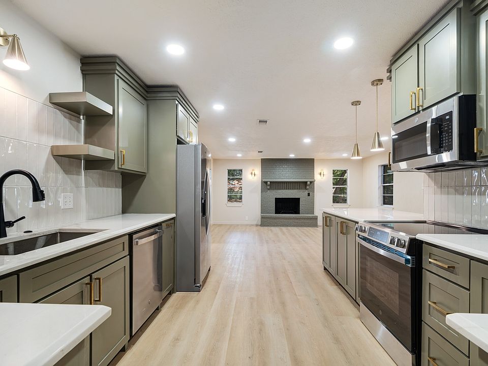 Modern feelNew light fixturesHigh-end upgradesStainless steel appliancesSoaker hose systemWasher and dryerQuartzite countertops