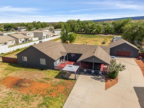 Welcome to your dream home nestled in the Orchard Mesa area of Grand Junction, CO. This magnificent 4-bedroom, 2 ½-bathroom residence is designed for both comfort and entertainment. Either entrance you come through, you'll be greeted by an expansive living space, perfect for gathering and entertaining friends. The beautiful kitchen is a chef's delight, boasting modern appliances, ample counter space, and stylish cabinetry. Adjacent to the kitchen is a spacious dining room, providing a charming setting for intimate meals or large dinner parties. This home is all about enjoying its surroundings, as it features a large covered and uncovered patio in the front. Sit back, relax, and take in the panoramic views across the Grand Valley of the Bookcliffs and Grand Mesa. The patio also includes a built-in sandbox and fire pit, adding to the ambiance and providing endless opportunities for outdoor enjoyment. The dual front entrances ensure a seamless flow between indoor and outdoor entertaining. Inside, vaulted ceilings and luxurious LVP flooring create an atmosphere of grandeur and elegance. The guest rooms are generously sized, providing comfort and privacy. The primary suite is a true sanctuary, featuring a spacious bedroom area, dual walk-in closets, and a lavish 5-piece bath. Pamper yourself in the large garden tub or indulge in the oversized walk-in shower, designed for ultimate relaxation. In addition to the main house, this property boasts an oversized, 29x29 detached garage, offering plenty of space for vehicles, storage, and projects. For those with recreational vehicles, there are two full RV hook-ups on the property, ensuring convenient accommodation for your outdoor adventures. Ample additional parking is also available. Step out onto the back patio and enjoying the natural beauty of the 2.12-acre lot. With irrigation available, you have the freedom to create the yard of your dreams, whether it be a lush garden, a play area, or a serene oasis. Don't miss out on this incredible opportunity to own a home that combines comfort, style, and the beauty of the Grand Valley. Schedule a showing today and make this dream home your own.