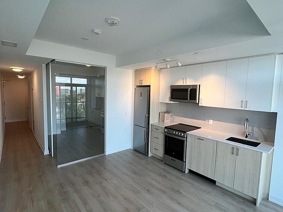 Discover a retreat that serves as your personal sanctuary. This spacious 1-bedroom, 1-bathroom condo radiates natural light and contemporary elegance, designed to inspire and indulge. The open-concept layout seamlessly combines functionality and style, featuring a private balcony for outdoor relaxation, soaring 9-foot ceilings that create an airy atmosphere, and a sleek quartz kitchen countertop. Modern touches like energy-efficient appliances and laminate flooring elevate your living experience. Conveniently located near Hwy 427 and the Gardiner Expressway, this residence offers easy access to public transit and a quick commute to downtown. One EV parking spot included. Experience the pinnacle of luxury living!