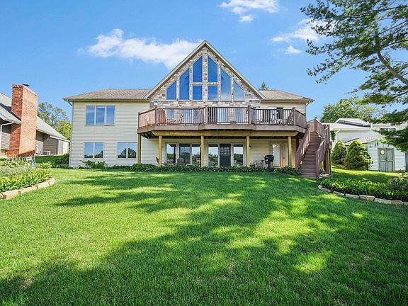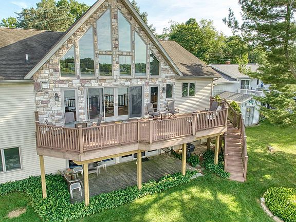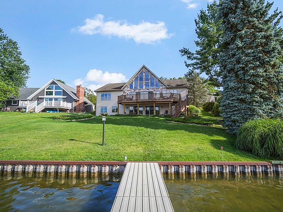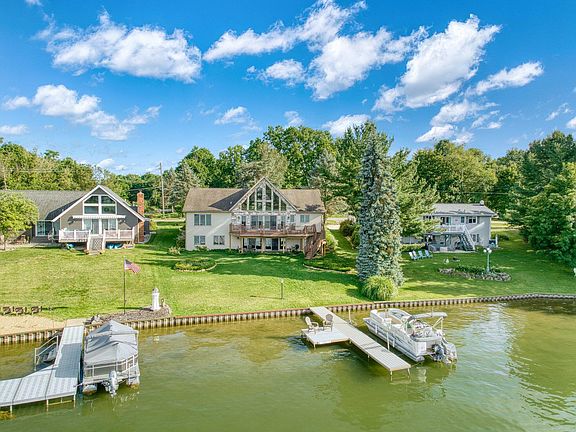 Stunning lakefront home on All-Sport South Lake Leann! This spacious 6-bedroom, 3-full-bath retreat boasts over 3000 square feet of finished living space. Enjoy breathtaking views of the main lake featuring both sunrises and sunsets from the large deck overlooking 60 feet of sandy frontage. This home features soaring ceilings and huge windows that flood the space with natural light. Wood and stone floors throughout add a touch of elegance. Popular features include a main floor master suite, large island kitchen and two fireplaces. The finished walkout lower level offers a family room, game room, and wet-bar space, perfect for entertaining. It then spills to a gently sloping well manicured lawn with low maintenance landscaping leading out to the lake.. Completely remodeled in 2007, this home includes a 2-car garage plus an additional lakeside garage on the lower level. BONUS! An extra off water lot provides ample overflow parking. Don't miss this opportunity to own a piece of paradise in the beautiful Irish Hills of Michigan, close to restaurants, golf, shopping, wineries and year around activities. This one is a stunner, don't miss out!