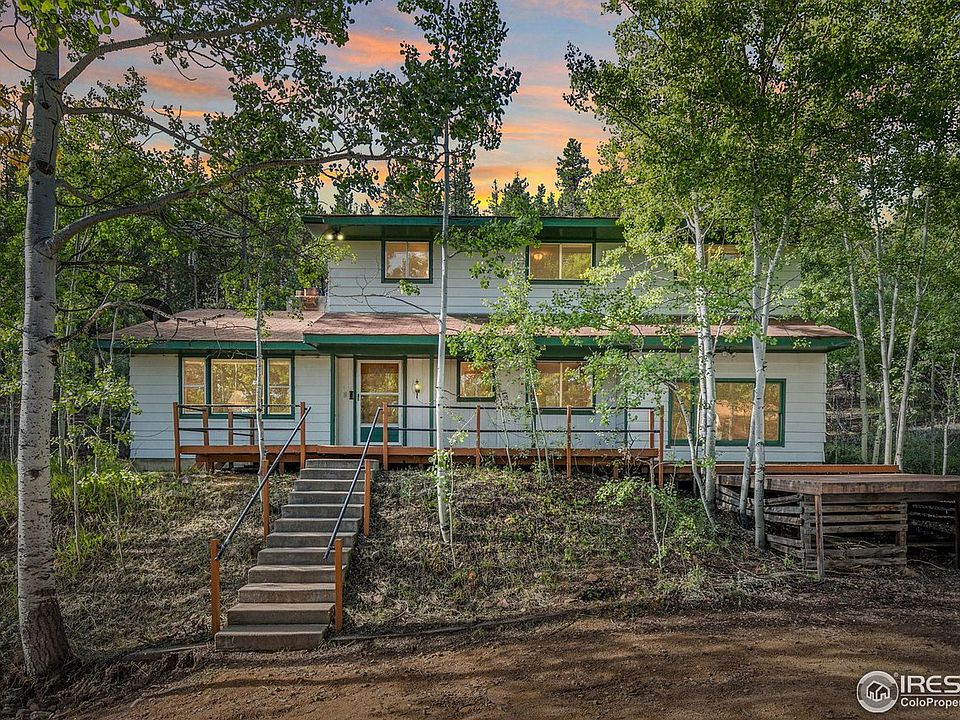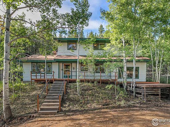 Nestled in Coal Creek Canyon, Colorado amidst towering spruce and aspen trees this mountain home offers 4 bedrooms / 3 bathrooms, plus an office at an incredible value! Privately set on 2.15 acres, this 2 story home is ready for your vision in this prime location within a short commute to the metro area but a world away from the hustle & bustle of city life. Enter into this spacious floor plan that greets you with beamed & vaulted ceilings and an oversized living room featuring a cozy woodstove insert and numerous windows that capture aspens in this serene setting. A huge country-style kitchen with ample counter and cabinet space has an eat-in dining area and includes a pellet stove that provides extra warmth & ambiance. The separate dining room adjacent to the kitchen can also double as a main level office with a 1/2 bath and laundry room conveniently located just around the corner. Spend time in the huge bonus workroom located just off the kitchen that could be improved to make a separate family room or use it as originally purposed: a work room with plenty of space for tools and projects. Upstairs find 4 bedrooms, a dedicated office and a full guest bathroom. Also on this level, the primary bedroom has an ensuite 3/4 bath, plus 2 large closets. Great peace of mind with a boiler system that is only 4 years old and a newer water heater. There is a 10x12 shed that can store all your outdoor gear with a level parking area. Located only 19 miles from Golden or Boulder on mostly all paved roads, this peaceful mountain sanctuary is just a short commute away from all the conveniences of city life. House needs some updates & TLC, but is very comfortable living in its present condition. Estate sale, sold 'as-is'. Furniture & snowblower are negotiable.