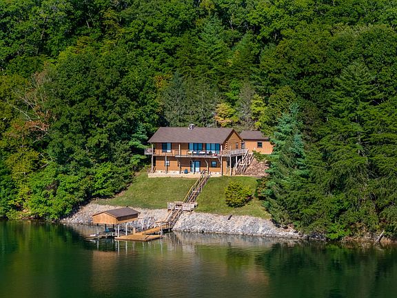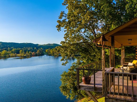 The pièce de résistance is the wrap-around porch, offering stunning views of the lake and mountains. Enjoy peaceful mornings sipping coffee and taking in the natural beauty. The property features 171 feet of water frontage with year-round water. The boat dock with a slip provides endless opportunities for water activities, from jet skiing and paddleboarding to fishing.