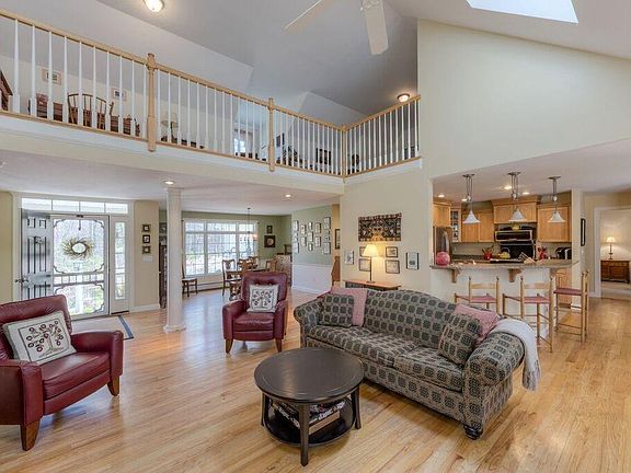 Open floor plan with one story living if needed but offers additional 2nd floor office/sitting area. Fantastic setting nestled in the Brimfield woods with perennial gardens, and color everywhere! Sit out on the back deck and listen to the birds and watch the wildlife. Inside, the fine detailed woodwork is impressive! Great room with soaring two story ceilings, hardwood floors, fireplace, and open to both the dining room and kitchen. Kitchen offers fabulous Elmira farmhouse country kitchen electric stove, two tiered breakfast bar, pantry closet, and dining area leading to the deck. Dining room looks over a water feature in the front yard. Master bedroom with full bath offering Jacuzzi tub and shower stall, walk in closet, 2 pedestal sinks and a water closet. Walkout basement features a pellet stove that will remain with the property. This home is a great value!