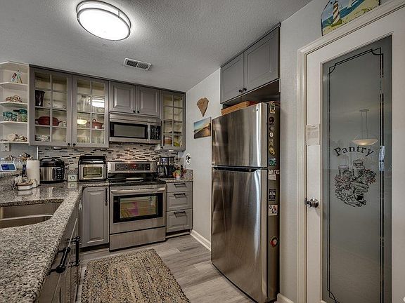 Step into this beautifully updated furnished condo offering over 1,300 square feet of heated living space — move-in ready and designed for comfort and style. Located in the desirable Fairways at River Oaks community, this 3-bedroom, 2-bathroom unit is sure to impress. Enjoy low-maintenance LVP flooring that flows seamlessly through the main living areas and bathrooms. The open-concept layout connects the kitchen to a spacious great room, perfect for entertaining or relaxing. The kitchen is a standout, featuring granite countertops, tile backsplash, stainless steel appliances, gray cabinetry, a breakfast bar, frosted-glass pantry door, and elegant glass-front upper cabinets. The large living and dining area opens to a screened porch with a sunshade — ideal for enjoying the fresh air year-round. The generously sized primary suite comfortably accommodates a king-sized bed and includes access to the screened porch. The ensuite bath features a modern vanity with solid surface countertops and a newly installed garden tub/shower combo. A walk-in closet provides ample storage, and large windows bring in plenty of natural light. On the opposite side of the unit, you'll find two additional guest bedrooms and a stylishly updated guest bath with a custom tile walk-in shower and solid surface countertop. The laundry closet includes a full-size washer and dryer, and there’s a convenient outdoor storage closet — perfect for beach gear or seasonal items. Located just a short walk from the community pool and picnic area, this condo offers both comfort and convenience in a prime location.