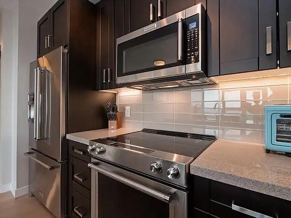 Delta Rise Amazing Suite! The open kitchen concept allows you to socialize with everyone around you creating a way to keep your guests entertained. Enjoy the morning views in your bedroom over looking mount baker, pacific ocean, the fraser rivers and over the north shore mountains, this view has it all. Unit comes with two parking stalls, gym, library & media room in the building