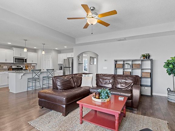 The private waterfront lot offers a terrific outdoor living space with a brick fireplace, and an impeccable home. Schedule your tour today of this 3 bedrooms, 2.5 bathroom ranch home, offering an open concept layout, split bedroom floorplan, covered front porch, and an extended 2 car garage. The kitchen has granite countertops, a corner pantry closet, an island sink, stainless steel appliances, and white cabinets accented with a tile backsplash. There are plenty of windows in the living room to allow for natural light. The 1/2 bathroom also has a granite top on the vanity, and is adjacent to the garage entry and laundry space. The primary suite provides a generous bedroom; the bathroom a tile shower, double sink vanity, and walk-in closet. The garage provides good storage, pegboard, marantec garage door opener, and attic pull-down steps. Andersen windows & patio door. Step up ceilings and ceiling fans in the primary suite and Living Room; 3 stylish arched doorways. Simplisafe security installed. Gas line to oven and dryer. All appliances included, along with 2 white adirondack chairs ideal for watching beautiful sunsets over the pond. The landscape beds are filled with native plantings and will provide beautiful blooms throughout the summer.