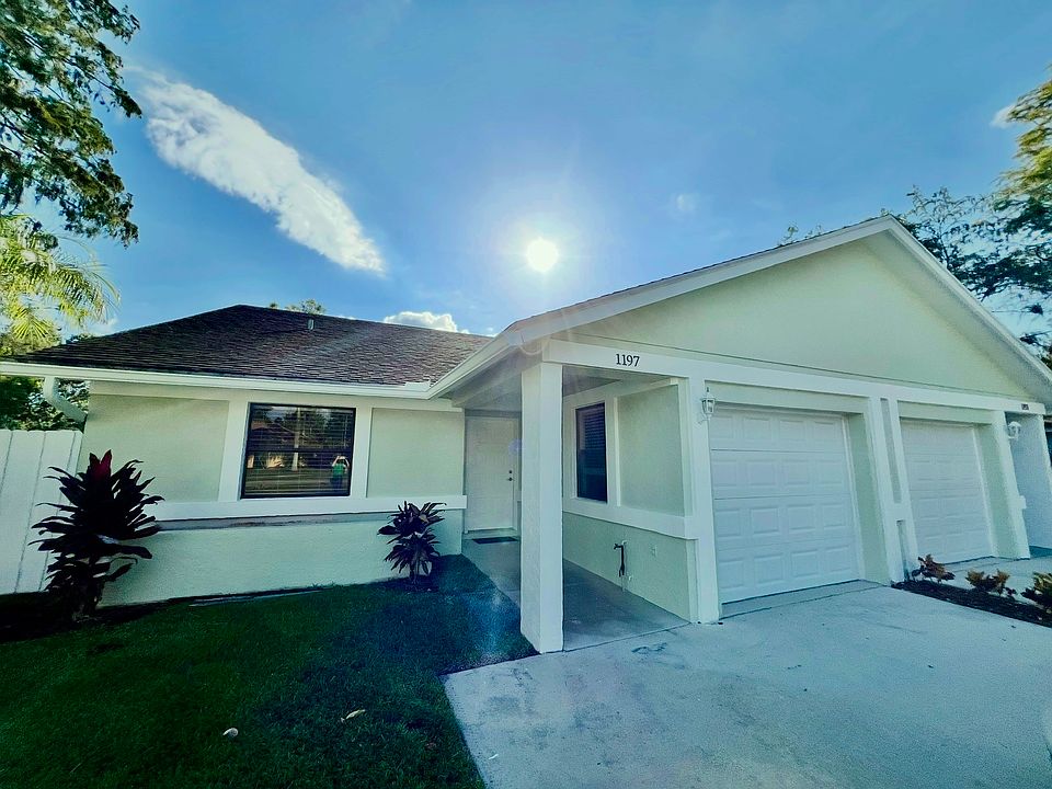 This is a 3 bedroom and 2 bath villa with a fully equipped kitchen (dishes, silverware, pots, etc), and fully furnished bedrooms, living room, and dining room. The villa has a 1 car garage and screened in back porch with a very large backyard. This property is located in a prime area in Wellington in a beautiful and quiet neighborhood within walking distance to shopping and dining, and with great school zoning. This is a very clean and welcoming home, it has been freshly painted and updated.