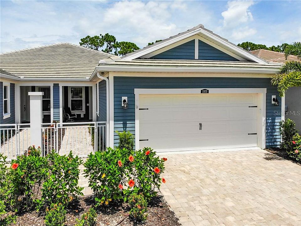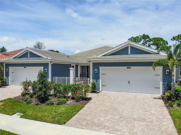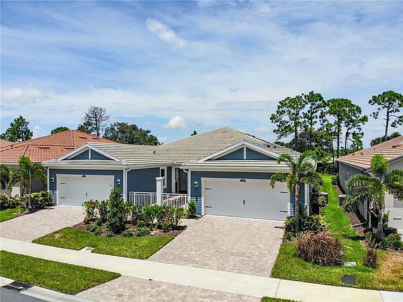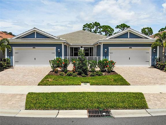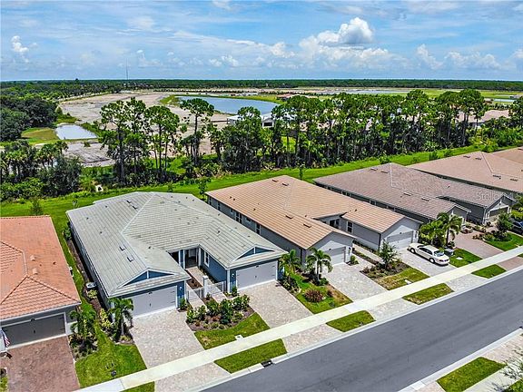 Contemporary 2/2 (plus a den) will impress any buyer with over $40,000 in builder upgrades and almost 1700 sq. ft. of living space. Open floor plan features 8 ft. doors, 12x24 ceramic tile in main living area, and a neutral palette. The kitchen has beautiful 42" cabinets finished with crown molding, granite countertops, large island, and a subtle tile backsplash. Master bedroom boasts walk in closet, ensuite bath featuring dual sinks, granite countertops, walk in shower with floor to ceiling tile, and glass doors. Second bedroom and bath can be closed off for private guest suite. Den is complete and private with newly added French doors. The OVERSIZED back covered Lanai (15x19) is a private sanctuary with views of preserve and a creek separating Phase 1 from Phase 2. Additional upgrades include rain gutters, window treatments, and designer light fixtures. Resort style community features a clubhouse, activities director, oversized pool and hot tub, fitness center, and sports courts all within the maintenance-free gated community of Renaissance at Wellen Park.