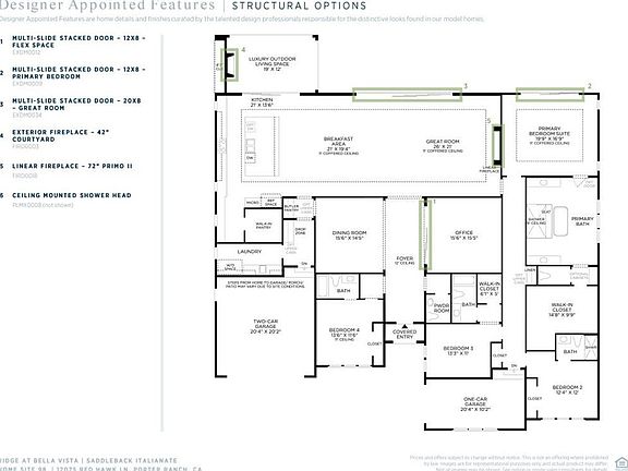 One-Story Saddleback home on a large interior homesite with all design studio appointed finishes have been selected. The Saddleback's welcoming covered entry and inviting foyer flow past the beautiful dining room into the expansive great room and casual dining area with coffered ceilings, with views to the desirable luxury outdoor living space beyond. The well-equipped gourmet kitchen is highlighted by a large center island with breakfast bar, plenty of counter and cabinet space, and spacious walk-in pantry. The lovely primary bedroom suite is enhanced by an elegant coffered ceiling, gigantic walk-in closet, and deluxe primary bath with dual-sink vanity, large soaking tub, luxe shower with seat, and private water closet. Secondary bedrooms feature ample closets and private full baths.