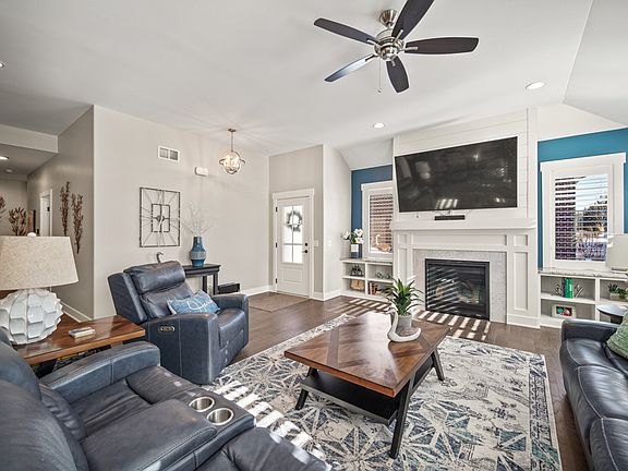Modern elegance meets comfort in this ranch duplex townhome, seamlessly blending the charm of a brand-new home with the practicality of four years of thoughtful refinement. This home is a true masterpiece of style and functionality. The open-concept floor plan showcases beautiful hardwood flooring throughout, plantation shutters, built-in cabinetry, and custom ceilings. The gourmet kitchen is a chef's dream, featuring expansive granite countertops, upgraded cabinetry, a massive island perfect for entertaining and convenience, and a walk-in pantry providing ample storage. The inviting living room centers around a cozy fireplace with custom built-ins and a mounted TV. The luxurious master suite impresses with a trey ceiling, an en suite bath, and a walk-in closet with custom organizers, while the second bedroom includes a built-in Murphy bed, effortlessly transitioning from an office to a guest retreat. The fully finished, insulated basement is designed for leisure and functionality, offering a custom bar, game area, family room with a second fireplace with a mounted TV, a generously sized third bedroom, a full bath, and a large shop area perfect for the craftsman or added storage. Outdoor living is a delight with a private, semi-covered expanded patio featuring an electric canopy, while the attached two-car garage adds convenience and storage. This home is the perfect blend of luxury, functionality, and comfort.