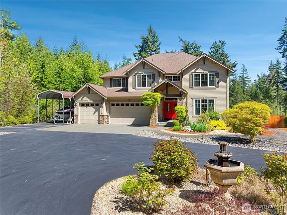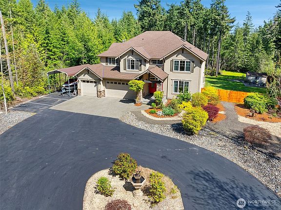Welcome to the perfect blend of privacy, tradition & convenience at this grand, gated estate on 5 beautiful partially fenced acres. Designed with timeless traditional style, the home features a huge chef’s kitchen w/ butler’s pantry, formal dining room, family room w/gas fireplace & huge entertainment-sized deck overlooking the sport court & manicured grounds. Upstairs, the spacious primary ensuite is a true retreat, complemented by a bonus room, 3 additional bedrooms & a full bath. The lower level is built for fun w/ pool table/game rec room, theater, gym, hot tub. Two more rooms are ideal for den/office/hobbies ~ you decide. Oversized 3 car garage, plenty of parking & easy access to Silverdale, Bases, & freeway, this property has it all!