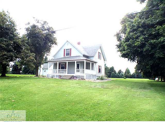 Country home on 1.5 acres! Classic wraparound porch, original oak hardwood, turned columns, oak kitchen with ceramic backsplash, 1st floor laundry, 1.5 baths, walk-in closet, vinyl exterior and Home Warranty!