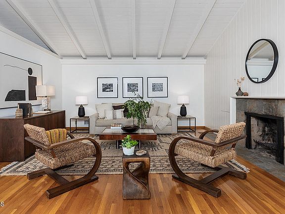 Set in a serene, wooded enclave that was once part of a historic Pasadena estate, this exceptional home designed by Stuart W. Fletcher, blends classic California Ranch and Mid-Century Modern styles. The residence features hallmark elements such as board-and-batten siding, gable roofs, and long, low lines--complemented by modern touches including exposed beams, open-concept living spaces, and expansive floor-to-ceiling glass walls that invite the outdoors in. The living room offers a comfortable seating arrangement as well as a section along the glass wall that ties seamlessly into the dining area. The kitchen features a U-shaped workspace, a charming breakfast nook by the window, and a small utility area separated by a low wall. A second masonry wall, open at the top, runs along the kitchen wall, screening the dining area from view and forming a small hallway that leads to two spacious bedrooms. The private primary suite is tucked away at the end of a long wing, accessed from the dining area via a glass-lined corridor overlooking the gardens. On one side: lush views of mature landscaping. On the other: banks of built-in storage. The family room is visible through an opening in the white pine-paneled fireplace wall in the living room, echoing the use of natural materials throughout. The same stone used on the fireplace continues to the hearth, unifying the design. A carport, discreetly screened by louvers, is situated to the left of the motor court, with a semi-circular driveway allowing for extra parking and easy turn around. The generous back terrace is accessible from the primary bedroom, dining room, living room, and family room--offering a true extension of the home's living space and an ideal setting for gracious outdoor entertaining. Located just down the street from Polytechnic School and close to the Langham Hotel, Lake Avenue's shops and restaurants, and the Huntington Library, this is a truly rare offering in one of Pasadena's most prestigious neighborhoods, combining timeless architecture with an unparalleled location on historic Arden Road.