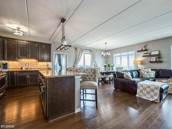 Showings start Saturday 10/18 - Stunning open-concept unit filled with natural light from abundant windows throughout. A formal entryway welcomes you into a beautifully designed kitchen featuring granite countertops, 42" cabinetry, stainless steel appliances, and a generous 6-foot island-perfectly positioned to overlook the expansive great room. There's ample space for both a dining area and a large sectional, making it ideal for entertaining. Soaring 9.5-foot ceilings enhance the airy, spacious feel. Step out onto the oversized balcony from either the great room or the primary suite and enjoy peaceful views of the pond. The primary bedroom features a luxurious en-suite bath and a spacious walk-in closet. The secondary bedroom is also en-suite and privately located, offering ideal separation from the primary suite. Both closets have built-in organizers. Additional highlights include a cozy den/home office, in-unit laundry, a powder room, two heated indoor garage spaces and storage locker. Conveniently situated near Milwaukee Avenue, Half Day Road, and I-94, this home is in the highly regarded Lincolnshire grade school and Stevenson High School districts. Walk to Starbucks and a variety of dining options, or take a short jog or bike ride to scenic forest preserve trails along the Des Plaines River.