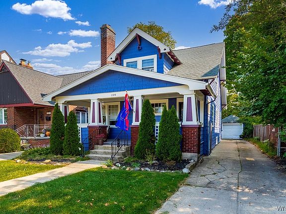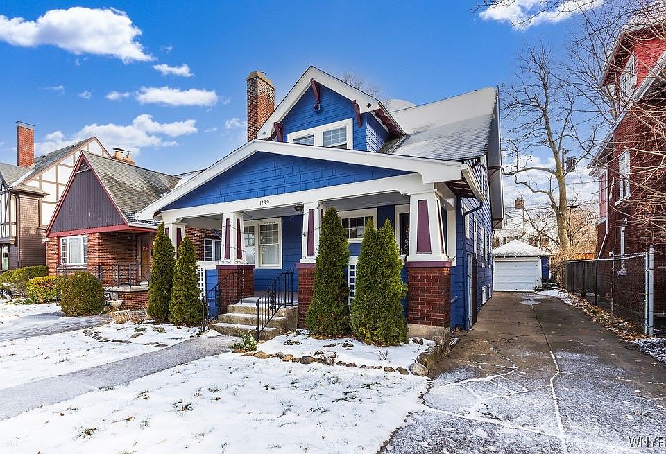Welcome to 1199 Elmwood! This freshly painted bungalow offers an unbeatable location steps away from the AKG and Burchfield Penney art galleries, blending classic architectural details with modern updates. Entering from the private front porch you are met with a formal entryway with original, built-in storage, tile floor and French doors into the inviting living room. The spacious living room features a gas fireplace (NRTC) and inlaid hardwoods floors. The space flows into the formal dining room also featuring inlaid floors, updated sconces, window seat, wainscotting and coffered ceilings. An efficient kitchen includes ample cabinet space, all the kitchen appliances plus a dishwasher. Completing the first level are two bedrooms and a full bath, which features an original stained-glass window for both ample natural light and privacy. On the second level the upstairs opens into a bonus living space with a second-floor laundry room. Both bedrooms are equal-sized and share a spacious common full bath with an original clawfoot tub. The basement features a second laundry and ample storage. The long driveway is complete with a one-car garage, and a private paver patio. With its proximity to numerous neighborhood amenities, this great-priced home is a perfect opportunity to live in one of the city's most desirable areas. Showings begin Saturday, 12/6 at 11 am. Join us for our open houses: Saturday and Sunday, 12/6 and 12/7 from 11 am - 1 pm.