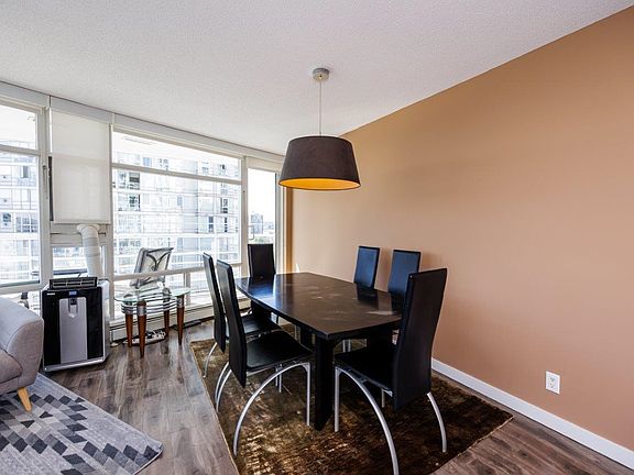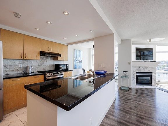 This corner suite Yaletown Vancouver Furnished Condo Rental at Aquarius I features 3 spacious bedrooms, 2 bathrooms, a den area and 1390 square feet of living space. This open concept design offers views of the city and marina from the corner windows that surround the space. Enjoy a modern living room with comfortable seating, a lovely fireplace and flat screen TV. This Vancouver furnished condo rental features a spacious kitchen with generous cabinet space, dark granite counters, modern black appliances including a gas range and space for all your pantry needs. Enjoy the modern dining set that seats up to 6 while you bask in the views that surround the space.