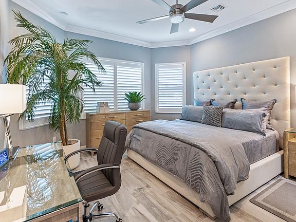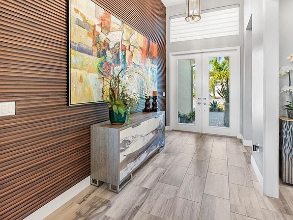 This home boasts modern amenities like automated shades, impact windows, and upgraded tile throughout. The oversized garage accommodates three cars and includes epoxy floors, extra storage, and is pre-wired for an electric car.