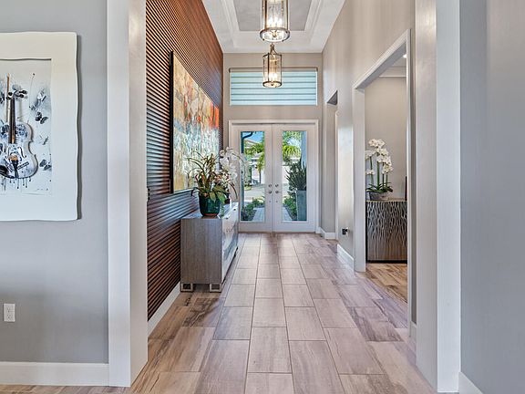 Step into modern luxury and be impressed by a home that effortlessly combines elegance with cutting edge convenience. Upon entry, you're welcomed by a striking bamboo paneled feature wall, setting a refined tone that resonates throughout the 2753 sq. ft. of living area, including 3 spacious bedrooms and 3 and 1/2 exquisite bathrooms. The great room exudes sophistication, highlighted by handcrafted beams and custom built shelving that encase the entertainment center. The gourmet kitchen stands ready to delight any chef, featuring premier appliances, expansive cabinetry adorned with granite tops and full backsplashes, you have ample storage and a perfect lakefront setting for culinary endeavors. Enhancements such as upgraded air conditioning system elevate the home's comfort and appeal. The waterfront locale provides serene vistas, while the full three car extended garage is equipped with an electric automobile charging outlet, adding to the home's future-forward features. This home is a haven of modern, sultry and enticing sophistication where every detail is designed to impress.