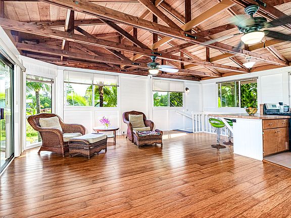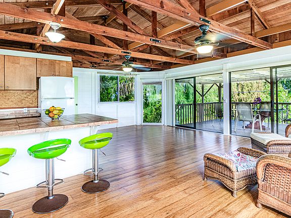 The upper floor is the main living area with the living, dining and kitchen areas that open to the spacious, upper lanai. A great place to hang out!! The upper floor has spacious airy feel due to the high vaulted ceiling and large glass windows and doors allowing in light and trade winds. The kitchen has bar seating, ceramic tile counter tops and flooring, and newer sturdy wood cabinets with plenty of storage. Appliances include a refrigerator, propane stove/oven, and microwave. The dining room can easily accommodate a table seating six comfortably. You will also find a guest bathroom with shower. Solid bamboo flooring was added to both floors a few years ago.