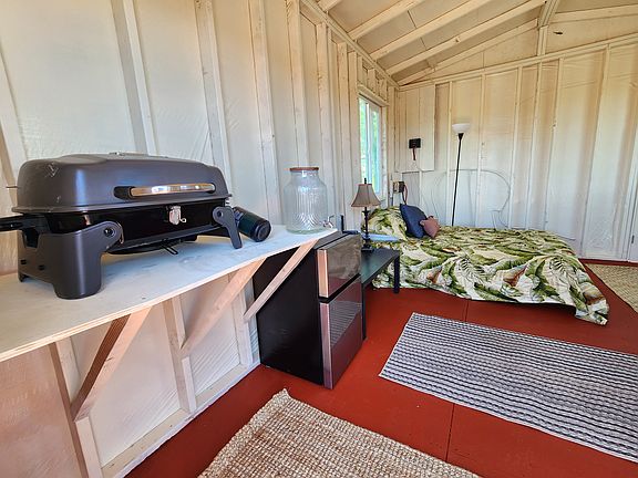 The 192 sf larger cabin is equipped with a solar system and catchment tank for off grid living.