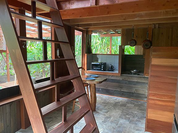 This beautiful private sanctuary is tucked away in the lush jungles of Seaview, secured behind a gated entrance.<br>Two fully screened-in rooms are separated by a covered lanai, totaling approximately 350 sq. ft., with loft spaces above both rooms. Distinctive “ghost wood” siding blends seamlessly with the jungle setting, while local hardwoods add warmth and character throughout.<br>An additional screened-in 120 sq ft room sits gracefully among towering Ohia trees, ti plants, and ferns. The covered lanai, workspace, and bathing area expand the functionality of this off-grid retreat.<br>Water is collected from 3 separate roofs into a large capacity gallon tank. Equipped with first-flush diverters, multi-stage screening, and a high-quality filtration system, the water supply is both abundant and reliable. <br>Power comes from four 330-watt, 24v solar panels paired with two 100ah 24v batteries — more than sufficient for comfortable, small-footprint living. Everything on the property is designed with sustainability in mind, with recycling and composting integrated into daily life.<br>The surrounding old-growth Hala forest creates a shaded canopy, keeping the land cool while allowing dappled sunlight to nourish the diverse array of tropical plants and food crops. Winding trails meander through the forest, creating an enchanting setting.<br>Wildlife abounds here: coqui frogs sing at dusk, geckos dart among the trees, and native birds thrive. The endangered Hawaiian hawk (‘Io) is a frequent visitor, soaring gracefully above the property. Three magnificent Ohia trees — believed to be over 100 years old and nearly 60 feet tall — stand as guardians of this magical landscape. <br>It is currently a small nursery. The owner has been propagating native plants to sell at local farmers' markets or a small stand out front. It is ready for someone to take over.<br>For those seeking even more privacy and possibilities, the adjoining lot is also available for purchase.