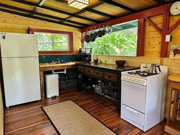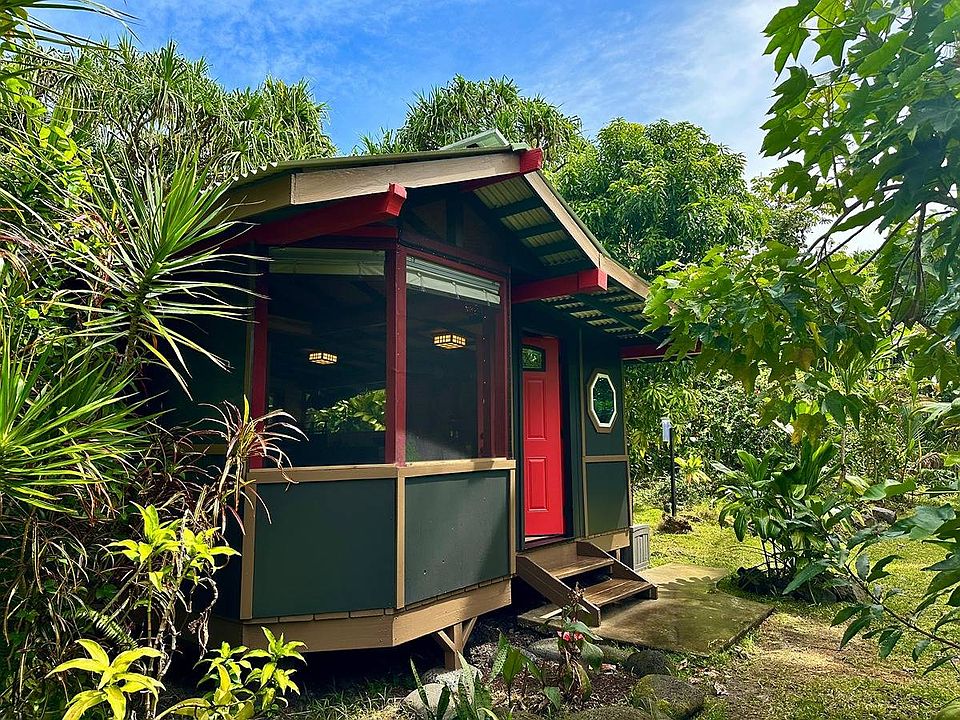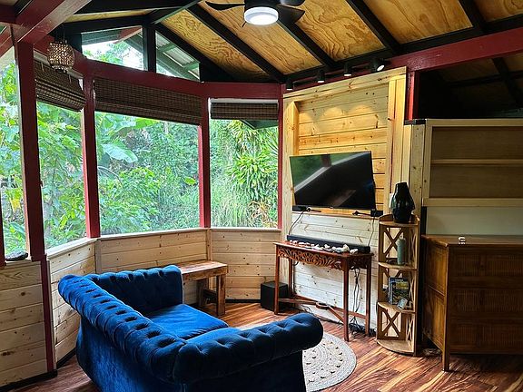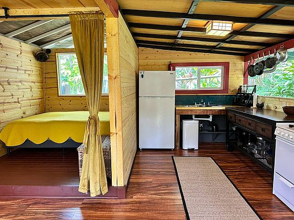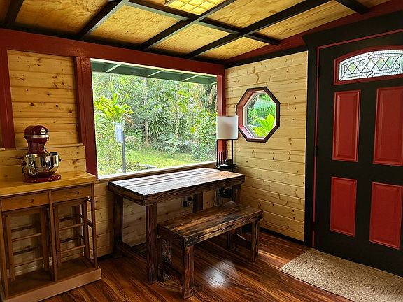 Gorgeous off-grid eco-home located in Kalapana Seaview Estates. This self-sufficient cottage sits on a lush 7,750 sq ft cultivated jungle lot with mature fruit trees less than 5 minutes’ drive to the beach! Home is move-in ready including all basic furnishings and appliances: propane stove, full-size electric fridge, KitchenAid stand mixer, Instant Pot, and microwave. Offers approximately 400 sq ft of living space in an open concept layout with custom features and built-ins. This house received a floor-to-ceiling remodel over the past year with oiled knotty pine walls and ceilings, stained cedar floor in the bedroom, Koa-style vinyl floors in the main living area, cedar storage loft, cedar-lined outdoor shower with on-demand hot water, and all new fixtures throughout. The 3000w/180ah solar system was also given a total overhaul with new components, wiring, switches, and breakers, affording power to spare. Could easily support more appliances or a second structure. Emergency generator included. Water comes from a 4000-gallon rainwater catchment tank with a new liner, cover, and 3-part quantum filtration system. House is wired for fiber optic high-speed internet and features a new Anran wireless security system. This property makes off-grid living feel simple and luxe! Landscaped yard full of ornamentals and mature fruit trees including banana, coconut, mango, avocado, mandarin, kumquat, guava, lilikoi, starfruit, and more young trees yet to fruit. A lava rock-rimmed garden could easily be converted to a koi pond. Seaview boasts three private community parks including the famously beautiful Seaview Lawn with its picturesque ocean views, excellent winter whale-watching, vivid sunrises, and world-class stargazing. Less than 5 minutes from Kehena Beach where dolphins often congregate. Approximately 25 min from downtown Pahoa or 45min-1hr from Hilo. This is a cash-only sale!