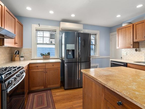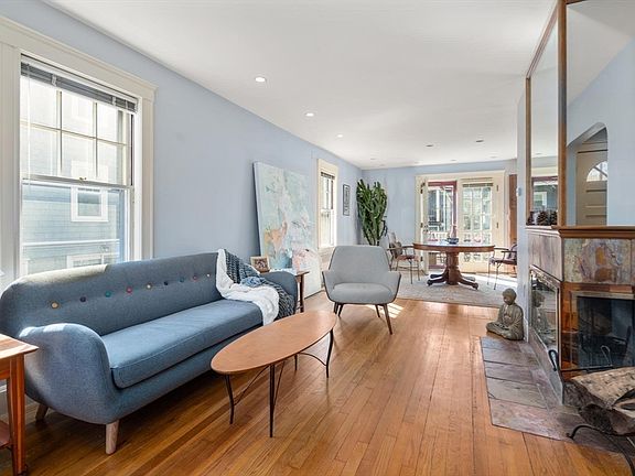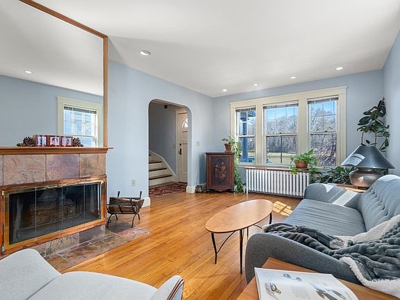 Set on a private way in a fantastic location with 4 bedrooms, 2.5 bathrooms. The open 1st floor seamlessly connects the kitchen, dining & living room. Living room with wood-burning fireplace, kitchen appointed with cherry cabinetry & Quartz countertops, dining room with French doors to an oversized deck for entertaining or a relaxing meal. A 2023 renovated half bathroom with washer/dryer complete this level. Second floor offers 3 bedrooms and generously sized bathroom. The third floor has a spiral staircase leading to an office & an additional large room used as a bedroom. Third floor picture windows have captivating views of Warren Fields Park. Lower level walk out is outfitted as a 2023 renovated in-law apartment containing large light-full bed, 1 bath, kitchenette with counter, dining & living room, W/D. Additional features: front porch, 2023 Navian gas heating, Mini Split cooling, 2-car parking on private way, and easy access to Fisher Hill Reservoir, Warren Field, the C&D Lines.
