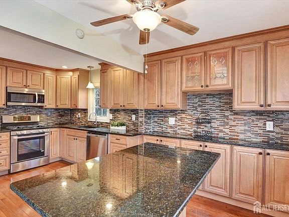 This beautiful 4 bedroom, 1 1/2 bath split level home is located in the highly sought-after Sayrewoods South neighborhood. The spacious kitchen is fully updated with beautiful custom cabinetry, soft close drawers, under cabinet lighting, granite countertops, wood floors, stainless steel appliances, an island, ceiling fan and French doors that open to a covered paver patio. The very large dining room has gorgeous wood floors, vaulted ceiling and skylights which flood the room with natural light. The living room has new luxury wood vinyl flooring and a bay window. The bedrooms and updated full bath are upstairs. Three of the 4 bedrooms have wood flooring, two of the bedrooms have wood under the carpeting. The primary bedroom has 2 large closets. The first floor has an updated half bath and bonus room. The bonus room can be used as a 5th bedroom, office, family room,... On the left side of the house is a walkway that leads to the backyard to a beautiful paver block walkway and covered paver patio. The backyard has a shed and extra storage space next to the patio. HWH 2021, Furnace 2021, Solar 2018. Newer siding. It is only minutes to shopping, dining and bus routes to NYC. Easy access to Rt 9 and Rt 18.